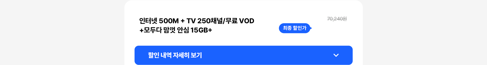 - *24년 8월 1일부터 결합 처리 완료 시 변경 된 인터넷 요금할인 금액 반영됩니다.